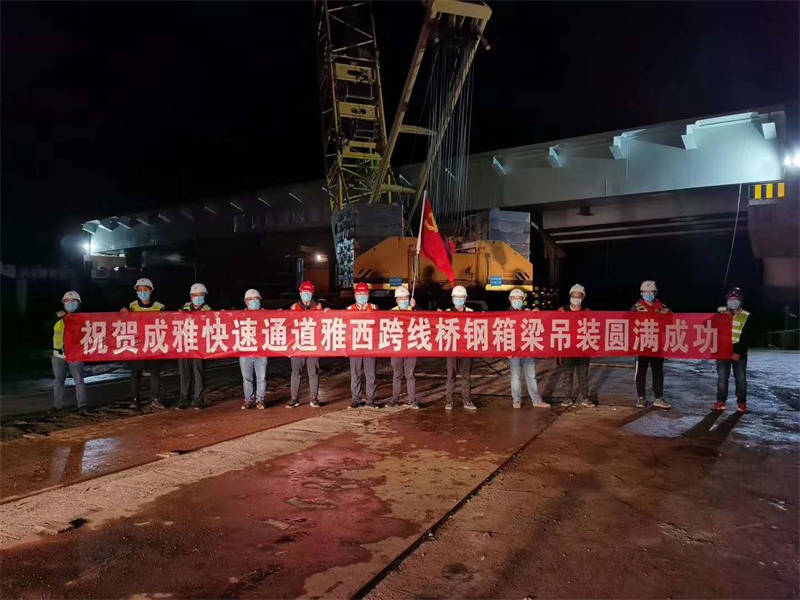 雅西跨線橋是成雅快速通道(雅安段)新建工程重要組成部分,該橋?yàn)閱慰绾喼т撓淞簶颍珮蛟O(shè)計(jì)鋼箱梁4片,單片重量約140噸、長55余米,體積大、自身重、運(yùn)輸困難,且投入的大型機(jī)械設(shè)備較多,施工組織難度大。為順利完成架設(shè)任務(wù),市交通局會同市交建集團(tuán)、交建項(xiàng)目管理公司、市公安局交警支隊(duì)和各參建單位多次組織召開專題會議,提前謀劃、細(xì)致安排、優(yōu)化組織,制定了施工專項(xiàng)方案和應(yīng)急措施,使整個施工過程按照標(biāo)準(zhǔn)化、程序化、規(guī)范化進(jìn)行施工,為鋼箱梁的成功吊裝奠定了堅(jiān)實(shí)的基礎(chǔ)。