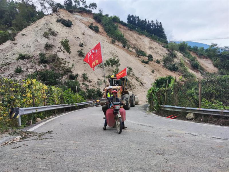 9月5日,項目經理吳學林同志帶領突擊隊率先抵達G108線菩薩崗。一次次余震攔不住他們的腳步,一聲聲哀嚎更堅定了他們逆行的決心。在通訊受阻的情況下,緊急調配2臺挖掘機、1臺推土機自G108線又轉戰(zhàn)新民鄉(xiāng),在受災嚴重的X067縣道開展道路搶通以及救援工作。在搶險一線,飛石及塌方的風險時刻危及著救災人員的自身安全!耙欢ㄒ嘤^察!首先要保證自己的安全才能更好地完成搶險工作!”項目經理吳學林同志、項目工程部副部長李健同志在轟鳴的搶險現(xiàn)場喊破嗓子指揮著各類機具搶險作業(yè)。待通訊恢復后,吳學林同志一邊組織現(xiàn)場搶險,一邊實時逐級上報受災和搶險情況,與第一時間趕來的集團公司和路橋公司現(xiàn)場指揮組,會商道路受阻情況,研究布置搶險保通工作。緊接著,石棉項目部搶險人員來不及片刻休息,馬不停蹄地投入到一處處塌方、受阻道路搶通中。