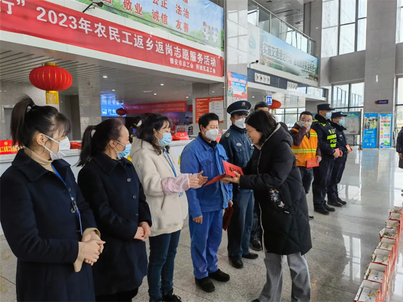 在雅安市汽車客運(yùn)站,李蓉調(diào)研了工會(huì)系統(tǒng)2023年農(nóng)民工返鄉(xiāng)返崗志愿服務(wù)活動(dòng)開展情況,看望慰問了民警、汽車客運(yùn)站職工、保安保潔等春運(yùn)一線人員,向大家致以新春祝福。李蓉要求,全市各級工會(huì)組織要統(tǒng)籌資源、精心組織,認(rèn)真做好送溫暖、農(nóng)民工返鄉(xiāng)返崗志愿服務(wù)活動(dòng)等工作,切實(shí)把黨和政府的關(guān)心關(guān)懷與工會(huì)組織的溫暖送到廣大職工群眾心坎上。