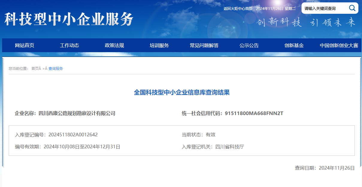 近日,四川省科學(xué)技術(shù)廳公布了本年度第五批入庫科技型中小企業(yè)名單,雅安交建集團(tuán)四川西康公路規(guī)劃勘察設(shè)計(jì)有限公司榮獲“國(guó)家級(jí)科技型中小企業(yè)”稱號(hào),標(biāo)志著公司在科技創(chuàng)新道路上邁向了新的高度。