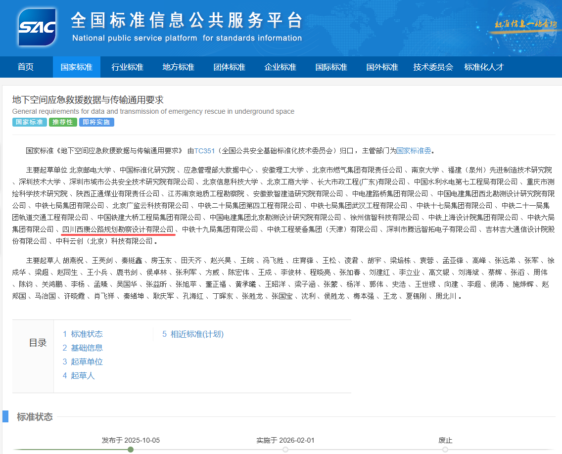 近日,由四川西康公路規(guī)劃勘察設計有限公司參與編制的推薦性國家標準GB/T 46338-2025《地下空間應急救援數(shù)據(jù)與傳輸通用要求》經國家標準委批準正式發(fā)布,將于2026年2月1日起正式實施。