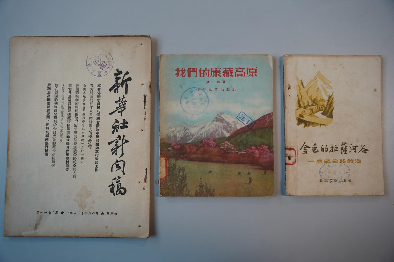 此次獲贈(zèng)文獻(xiàn)具有重要?dú)v史價(jià)值,《金色的拉薩河谷(康藏公路詩(shī)選)》以詩(shī)歌形式記錄了康藏公路(今川藏公路)建設(shè)者的奮斗歷程,其中的不少詩(shī)篇被作曲家譜寫(xiě)成歌曲;《我們的康藏高原》著重描寫(xiě)了康藏公路的修筑歷程,講述了筑路英雄們的事跡及西藏和平解放后的新面貌;1953年8月8日發(fā)表的新華社新聞稿原件,以第一手資料還原了康藏公路修建期間的重要?dú)v史節(jié)點(diǎn)。