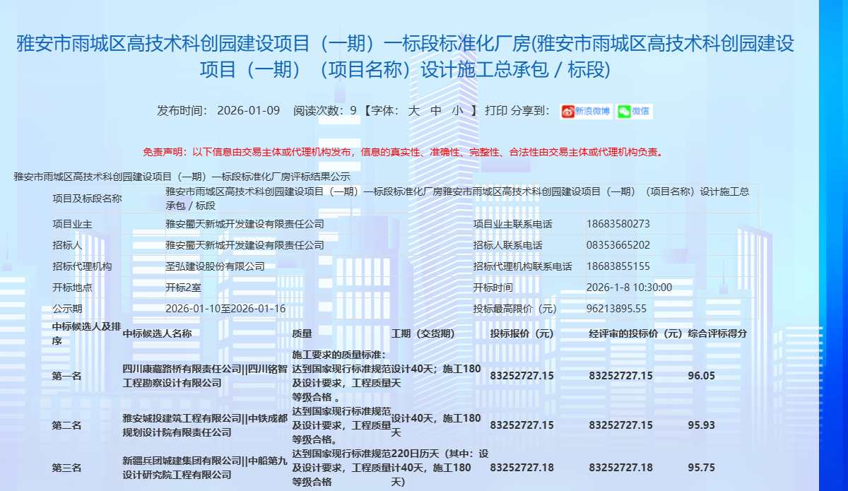 蓄勢突破,奮楫開新?挡芈窐蚬境晒孬@雅安市雨城區(qū)高技術(shù)科創(chuàng)園建設項目(一期)一標段標準化廠房項目,中標金額8325.27萬元,為公司2026年發(fā)展強勢開篇,迎來馬年“開門紅”。