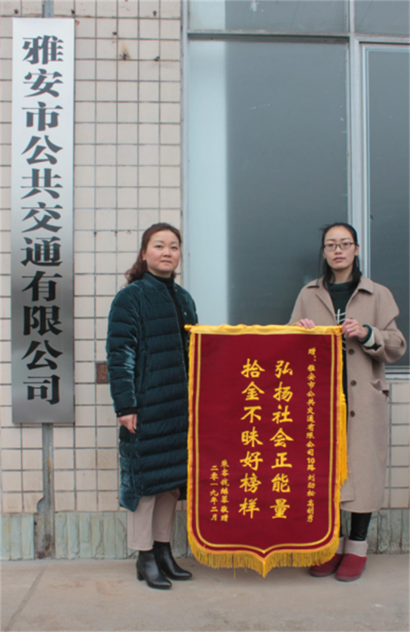 “請一定把我們的感謝帶給駕駛員和發(fā)班員!2月14日下午17時(shí)15分左右,一名手拿寫著“拾金不昧好榜樣弘揚(yáng)社會正能量”錦旗的市民錢續(xù)露來到雅安市公共交通有限公司,將錦旗送到了經(jīng)理助理方媛手上,請她把感謝之意轉(zhuǎn)達(dá)給10路公交車駕駛員劉進(jìn)松和發(fā)班員高胡秀。