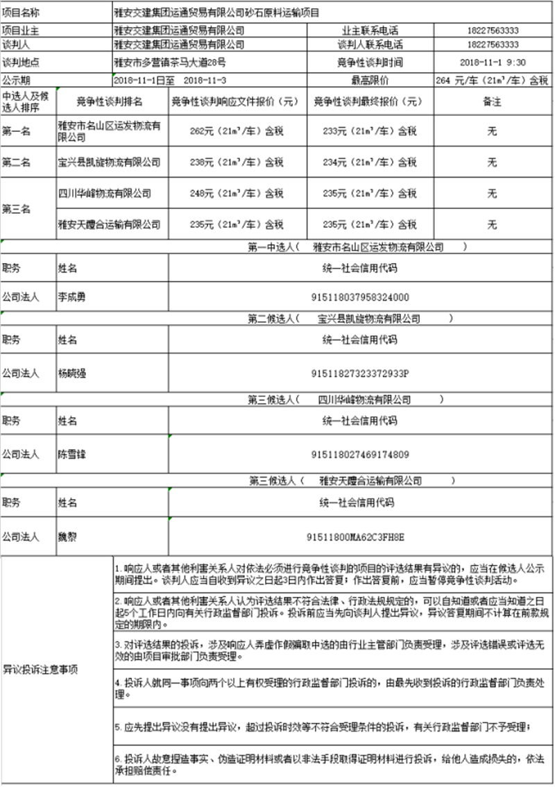 雅安交建集團運通貿(mào)易有限公司砂石原料運輸項目競爭性談判中選人及候選人公示