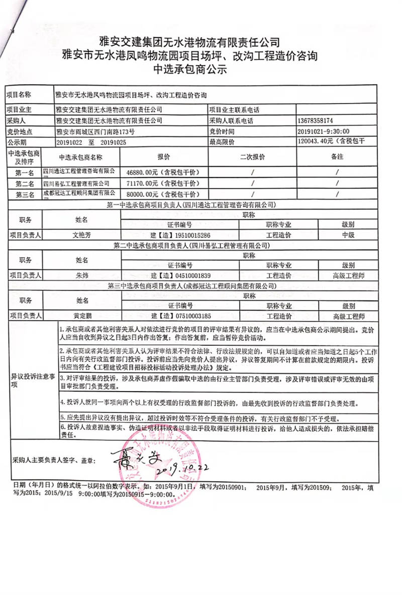 雅安交建集團(tuán)無(wú)水港物流有限責(zé)任公司雅安市無(wú)水港鳳鳴物流園項(xiàng)目場(chǎng)坪、改溝工程造價(jià)咨詢中選承包商公示