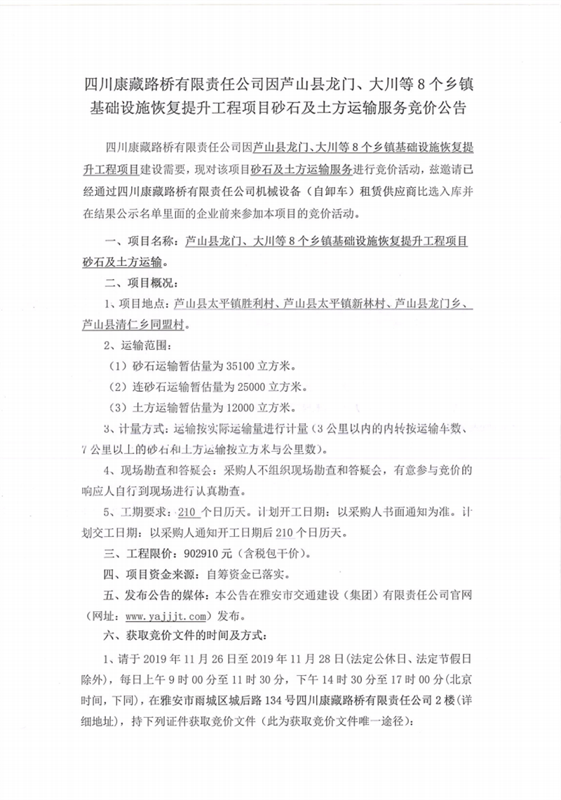 四川康藏路橋有限責(zé)任公司蘆山縣龍門、大川等8個(gè)鄉(xiāng)鎮(zhèn)基礎(chǔ)設(shè)施恢復(fù)提升工程項(xiàng)目砂石及土方運(yùn)輸服務(wù)競(jìng)價(jià)公告