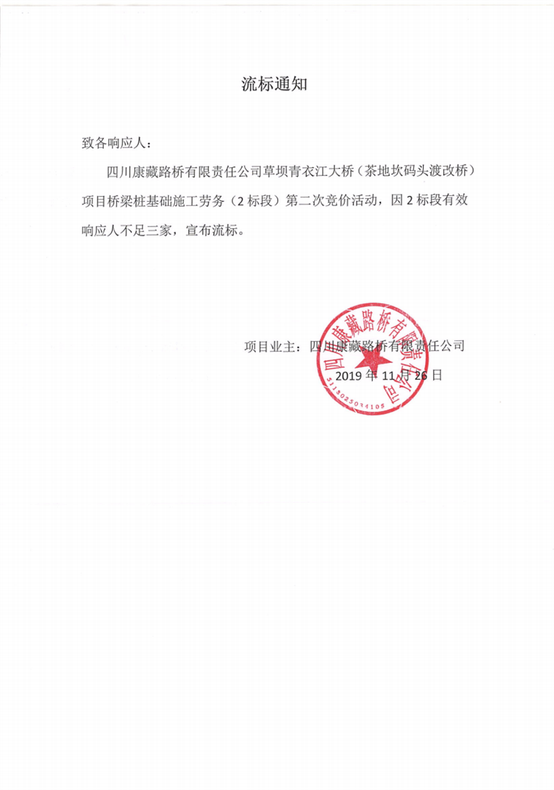 四川康藏路橋有限責(zé)任公司草壩青衣江大橋(茶地坎碼頭渡改橋)項(xiàng)目橋梁樁基礎(chǔ)(2標(biāo)段)施工勞務(wù)競價(第二次)流標(biāo)通知