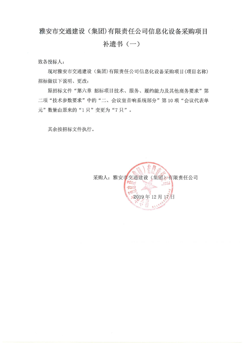 雅安市交通建設(shè)(集團(tuán))有限責(zé)任公司信息化設(shè)備采購(gòu)項(xiàng)目補(bǔ)遺書(一)