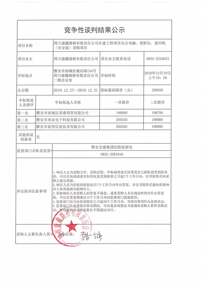 四川康藏路橋有限責(zé)任公司在建工程項(xiàng)目辦公電腦、投影儀、復(fù)印機(jī)(含安裝)采購項(xiàng)目競(jìng)爭(zhēng)性談判結(jié)果公示