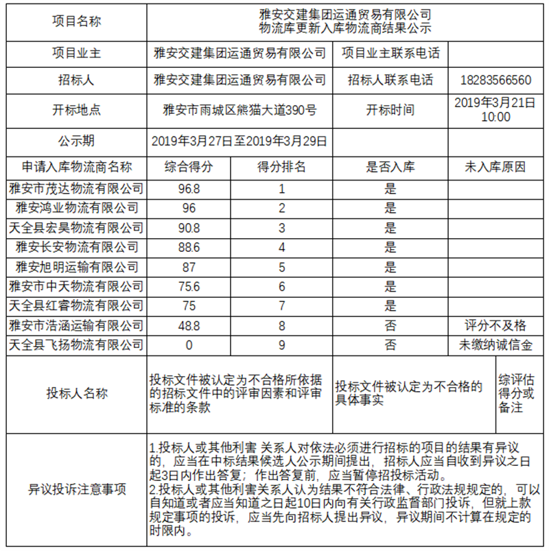 雅安交建集團(tuán)運(yùn)通貿(mào)易有限公司物流庫更新入庫物流商結(jié)果公示
