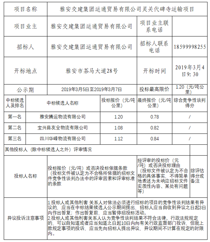 雅安交建集團(tuán)運(yùn)通貿(mào)易有限公司靈關(guān)代碑寺運(yùn)輸項目競爭性談判結(jié)果公示
