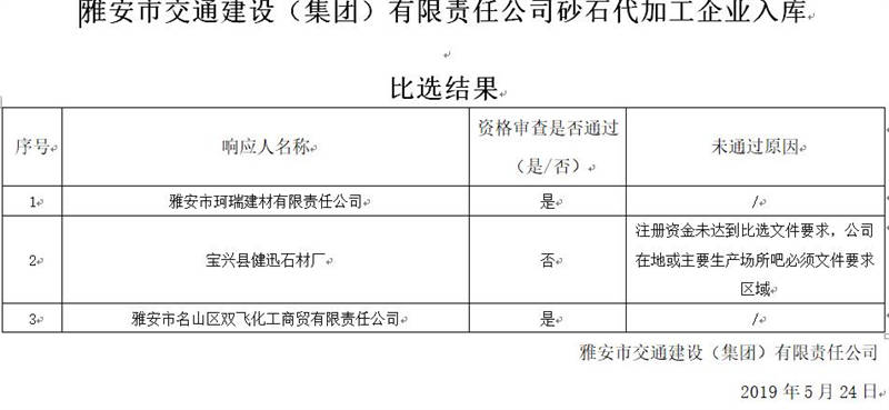 雅安市交通建設(shè)(集團)有限責(zé)任公司砂石代加工企業(yè)入庫比選結(jié)果公示