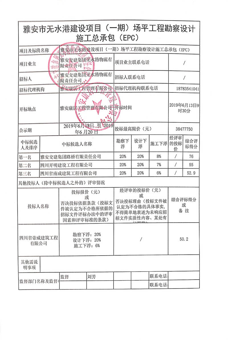 雅安市無水港建設(shè)項(xiàng)目(一期)場(chǎng)平工程勘察設(shè)計(jì)施工總承包(EPC)公開招標(biāo)結(jié)果公示