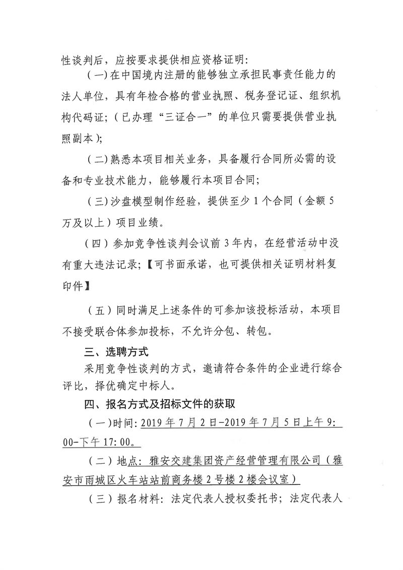 雅安交建集團資產(chǎn)經(jīng)營管理有限公司成雅高速金雞關(guān)互通及服務(wù)區(qū)項目(雨名快速通道)沙盤模型制作安裝項目競爭性談判公告