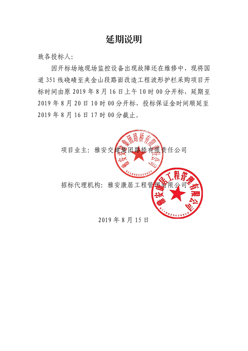 雅安交建集團(tuán)路橋有限責(zé)任公司國(guó)道351線磽磧至夾金山段路面改造工程波形護(hù)欄采購(gòu)延期說明