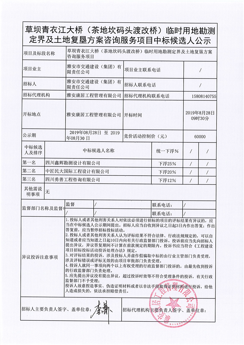 雅安市交通建設(shè)(集團(tuán))有限責(zé)任公司草壩青衣江大橋(茶地坎碼頭渡改橋)臨時(shí)用地勘測定界及土地復(fù)墾方案咨詢服務(wù)項(xiàng)目競價(jià)結(jié)果公示