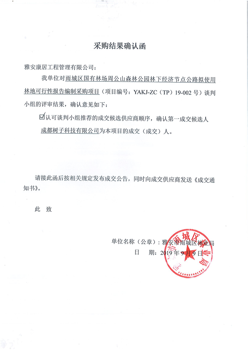 雅安市雨城區(qū)林業(yè)局雨城區(qū)國有林場周公山森林公園林下經(jīng)濟節(jié)點公路擬使用林地可行性報告編制采購項目競爭性談判結果公示