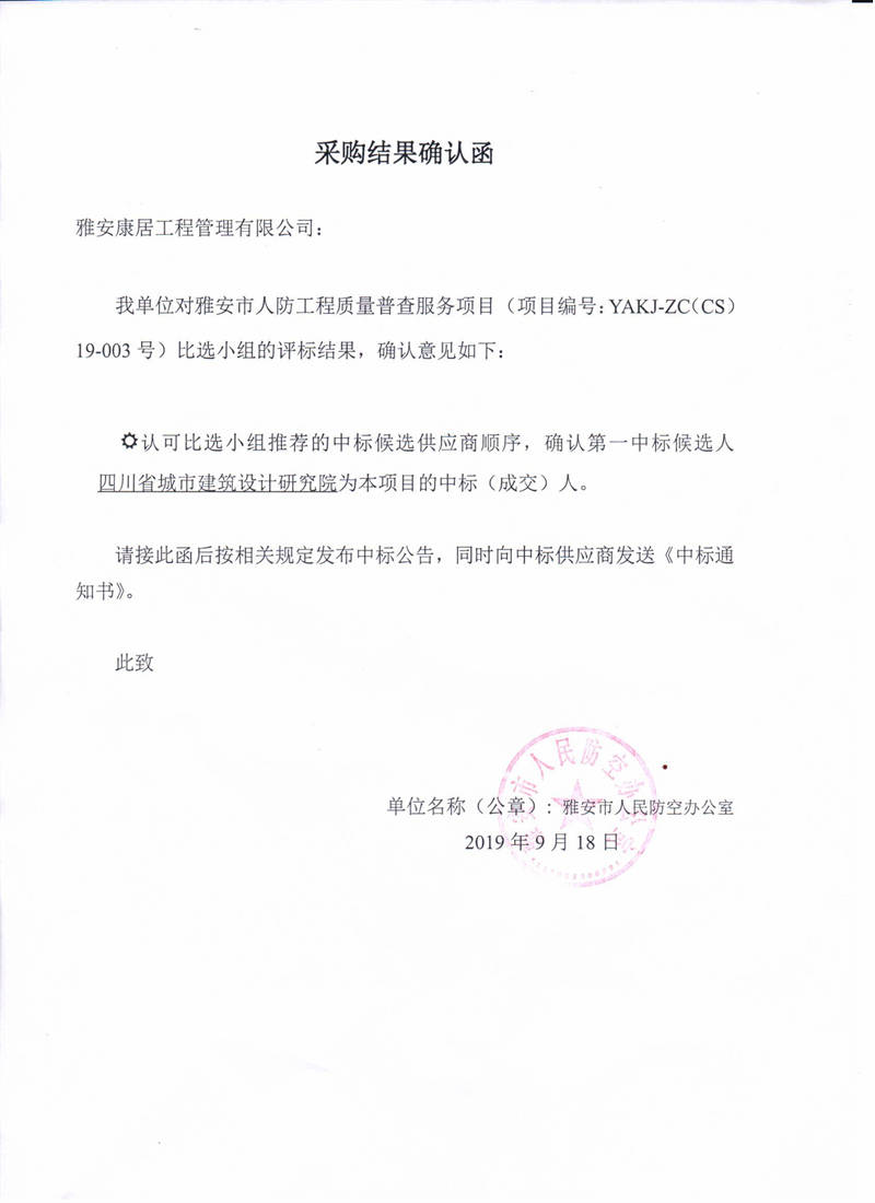 雅安市人民防空辦公室雅安市人防工程質(zhì)量普查服務項目評標結(jié)果公示