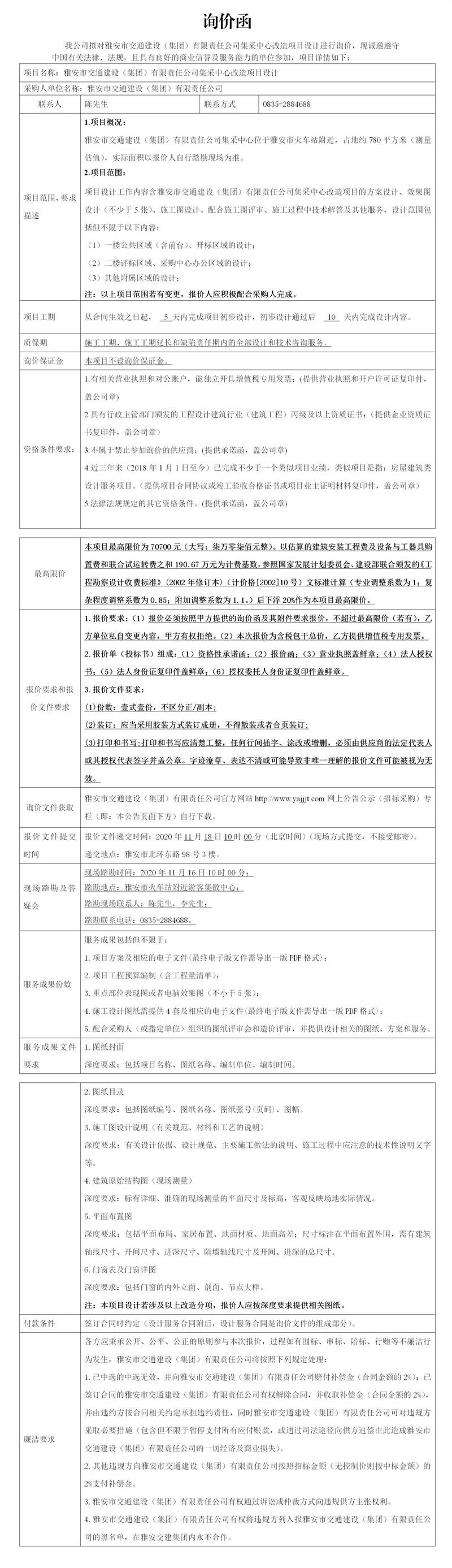 雅安市交通建設(shè)(集團(tuán))有限責(zé)任公司集采中心改造項(xiàng)目設(shè)計(jì)詢價公告