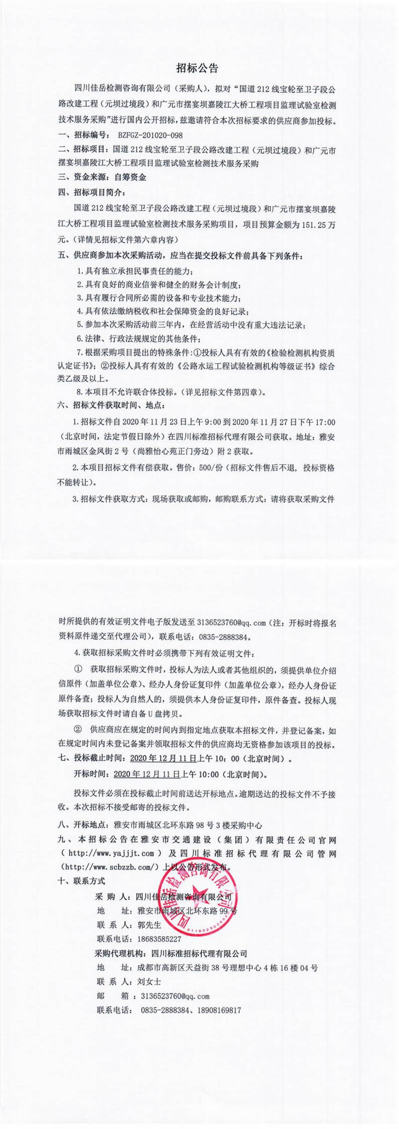 四川佳岳檢測咨詢有限公司國道212線寶輪至衛(wèi)子段公路改建工程(元壩過境段)和廣元市擺宴壩嘉陵江大橋工程項目監(jiān)理試驗室檢測技術服務采購招標公告