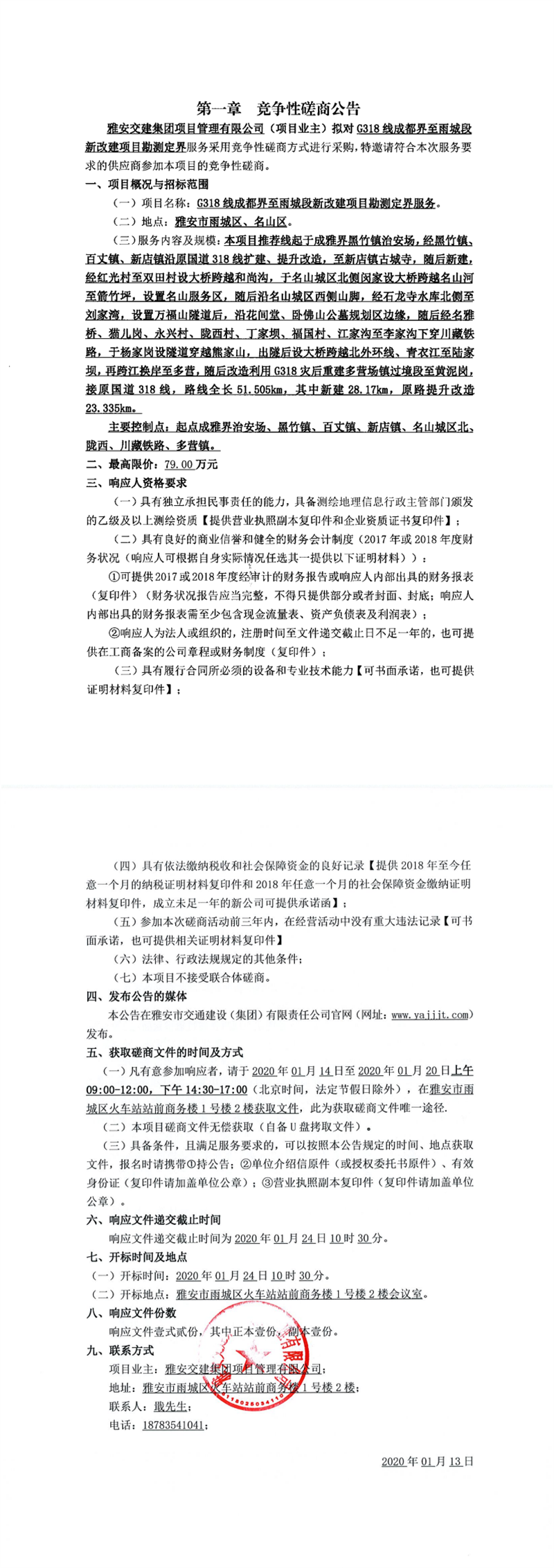 雅安交建集團項目管理有限公司G318線成都界至雨城段新改建項目勘測定界服務(wù)競爭性磋商公告