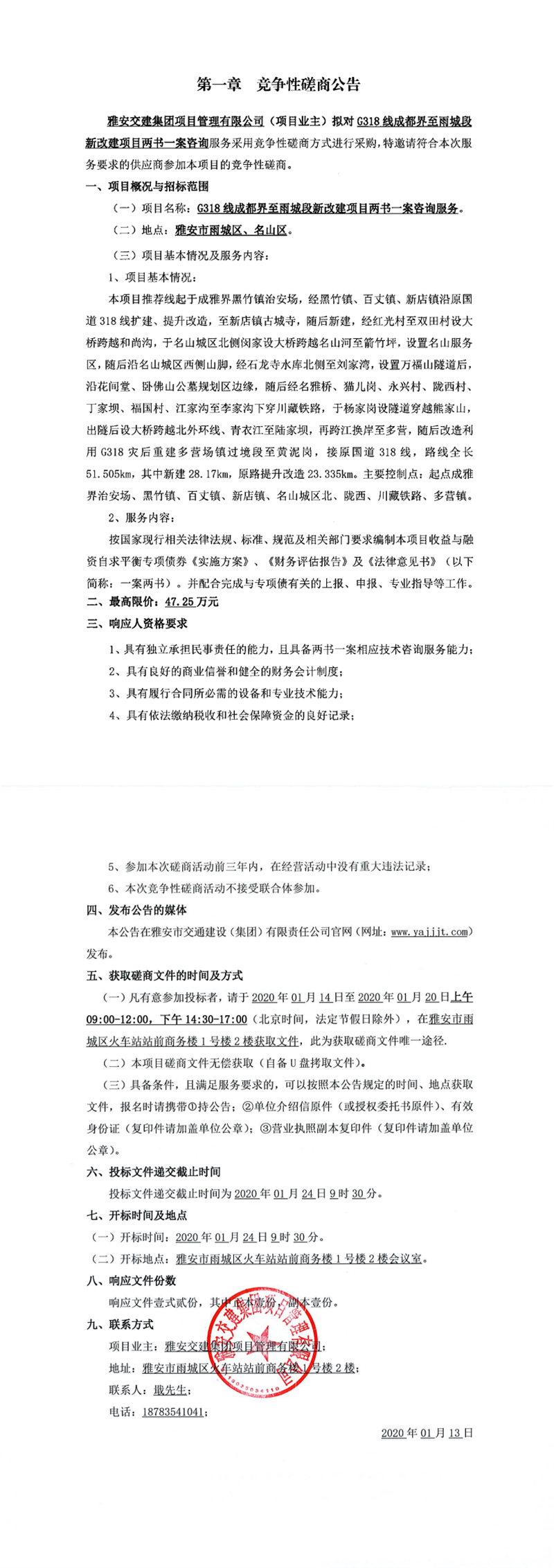 雅安交建集團項目管理有限公司G318線成都界至雨城段新改建項目勘測定界服務競爭性磋商公告