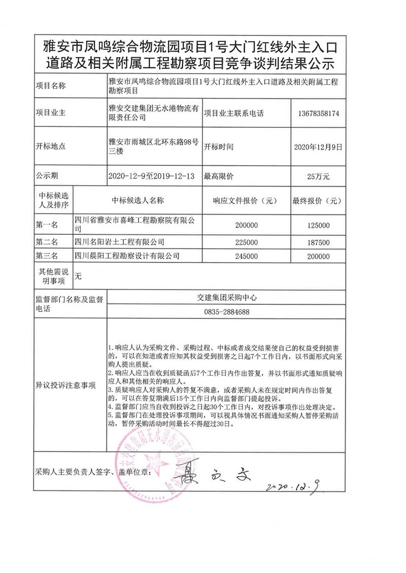 雅安交建集團無水港物流有限責任公司雅安市鳳鳴綜合物流園項目1號大門紅線外主入口道路及相關附屬工程勘察項目競爭談判結(jié)果公示