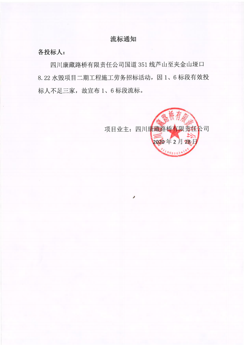 四川康藏路橋有限責(zé)任公司國(guó)道351線蘆山至夾金山埡口8.22水毀項(xiàng)目二期工程施工勞務(wù)(1標(biāo)段、6標(biāo)段)流標(biāo)通知