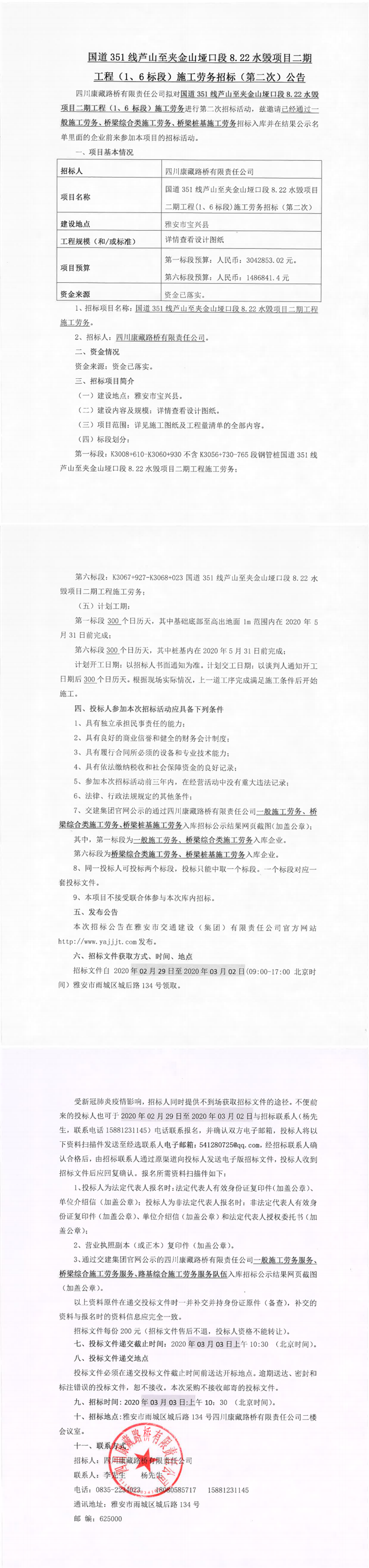 四川康藏路橋有限責任公司國道351線蘆山至夾金山埡口8.22水毀項目二期工程(1、6標段)施工勞務招標(第二次)公告