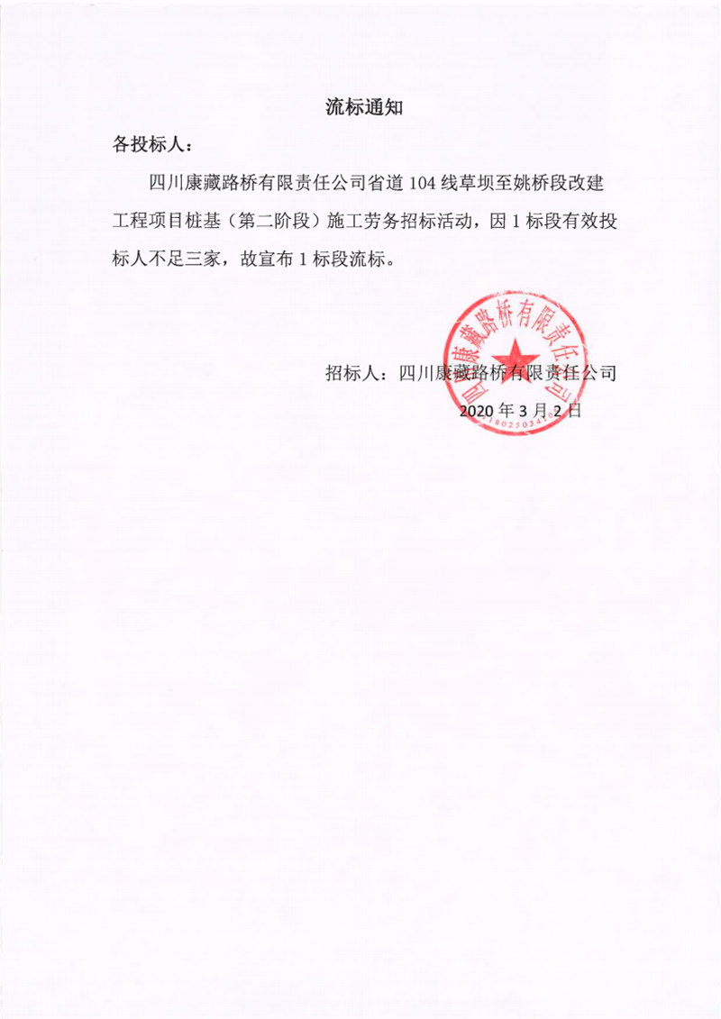 四川康藏路橋有限責(zé)任公司省道104線草壩至姚橋段改建工程項目樁基(第二階段)施工勞務(wù)流標通知