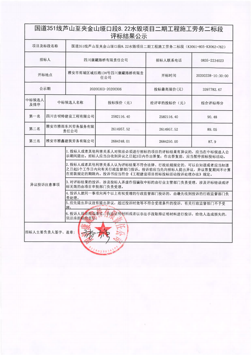 四川康藏路橋有限責(zé)任公司國道351線蘆山至夾金山埡口段8.22水毀項(xiàng)目二期工程施工勞務(wù)二標(biāo)段評(píng)標(biāo)結(jié)果公示