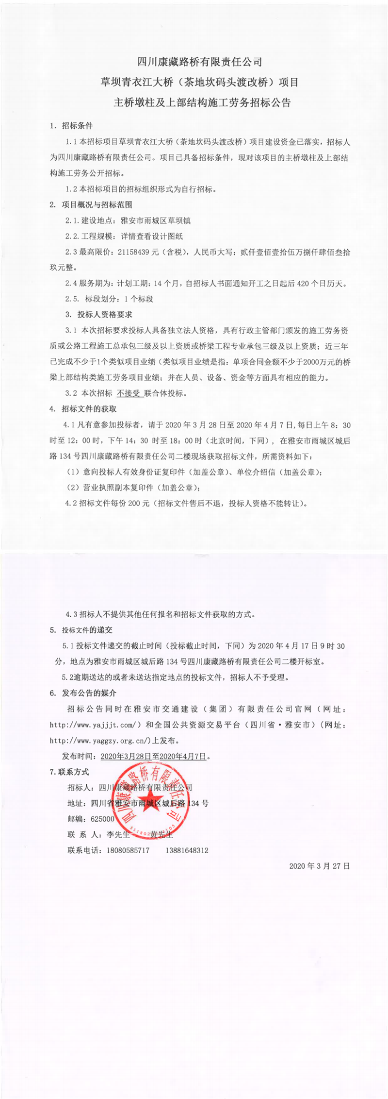 四川康藏路橋有限責任公司草壩青衣江大橋(茶地坎碼頭渡改橋)項目主橋墩柱及上部結構施工勞務招標公告