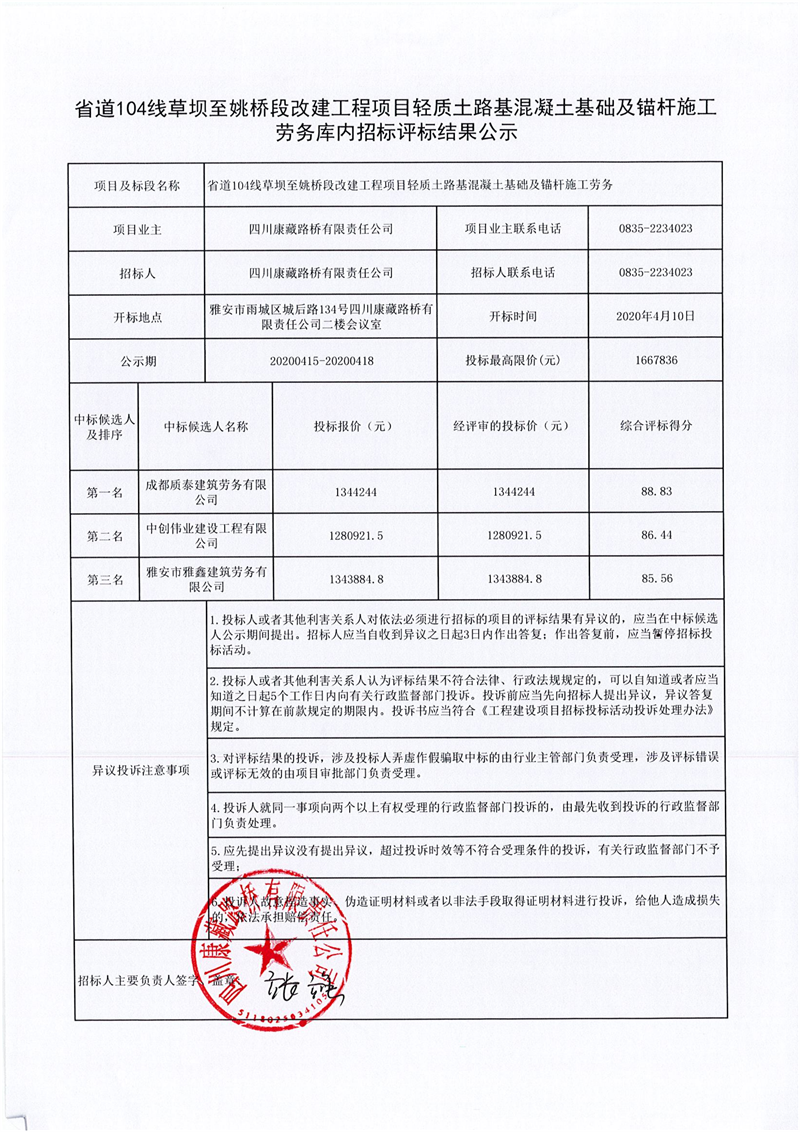 四川康藏路橋有限責(zé)任公司省道104線草壩至姚橋段改建工程項目輕質(zhì)土路基混凝土基礎(chǔ)及錨桿施工勞務(wù)庫內(nèi)招標(biāo)評標(biāo)結(jié)果公示