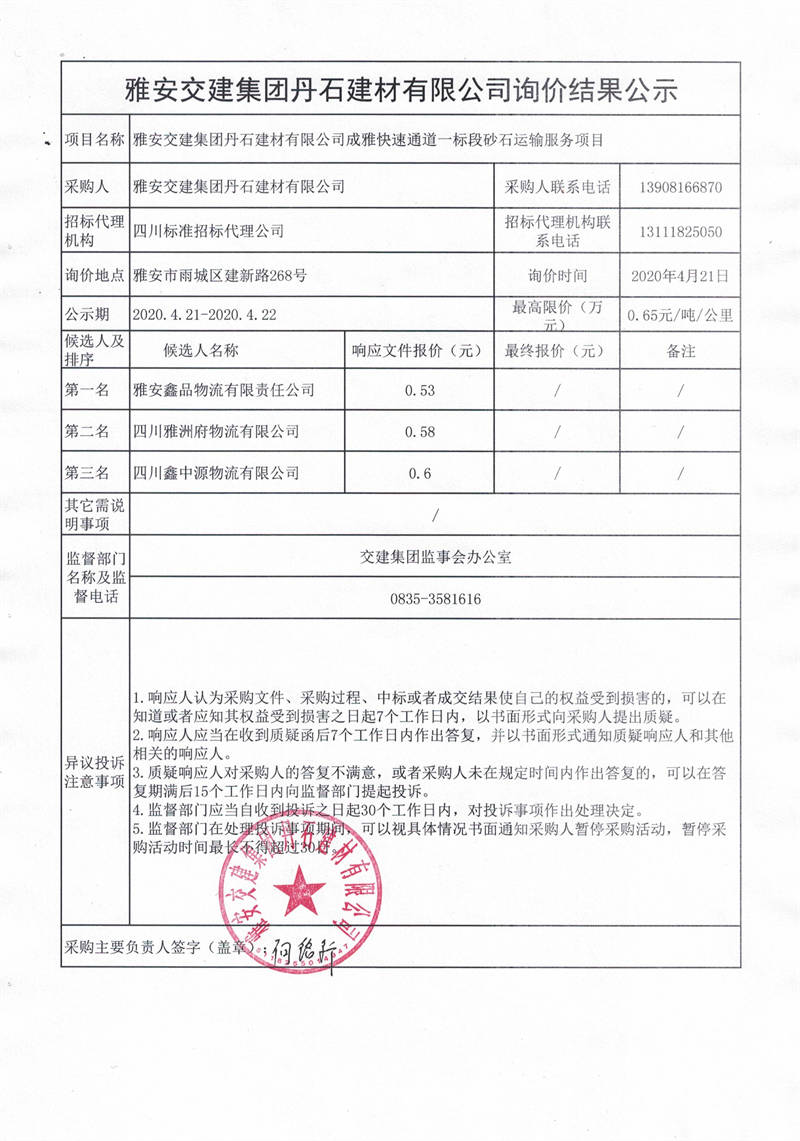 雅安交建集團丹石建材有限公司成雅快速通道一標段砂石運輸服務項目詢價結果公示