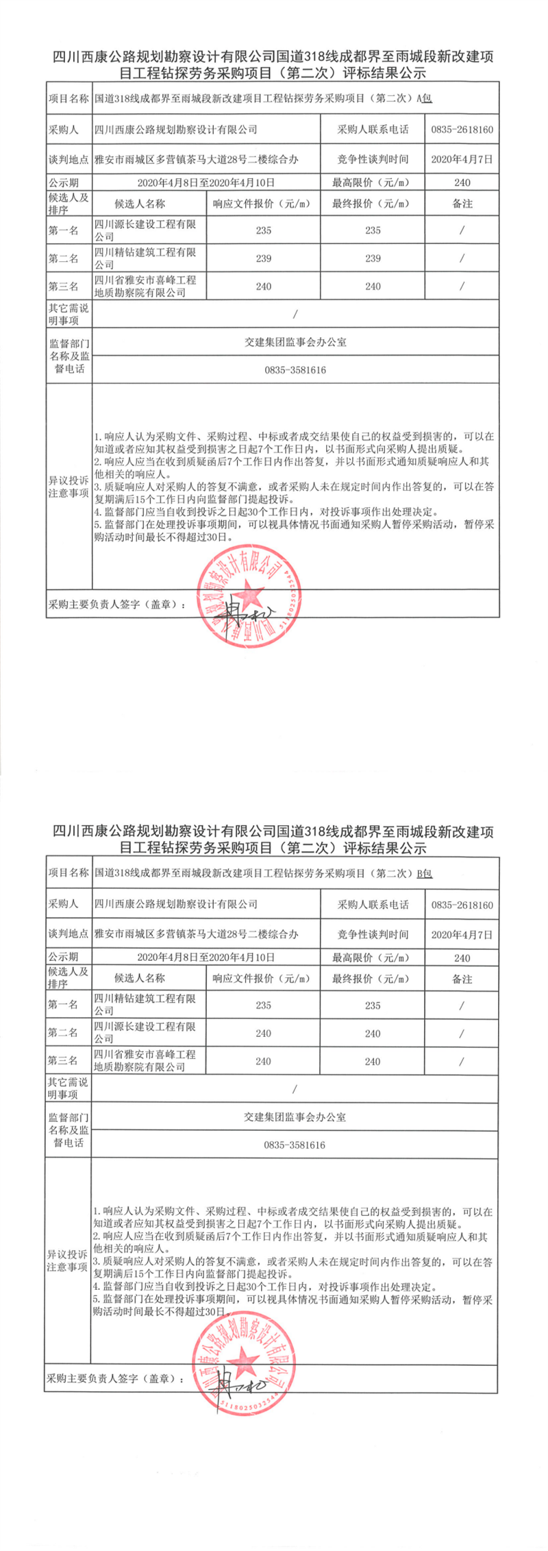 四川西康公路規(guī)劃勘察設計有限公司國道318線成都界至雨城段新改建項目工程鉆探勞務采購項目(第二次)評標結果公示