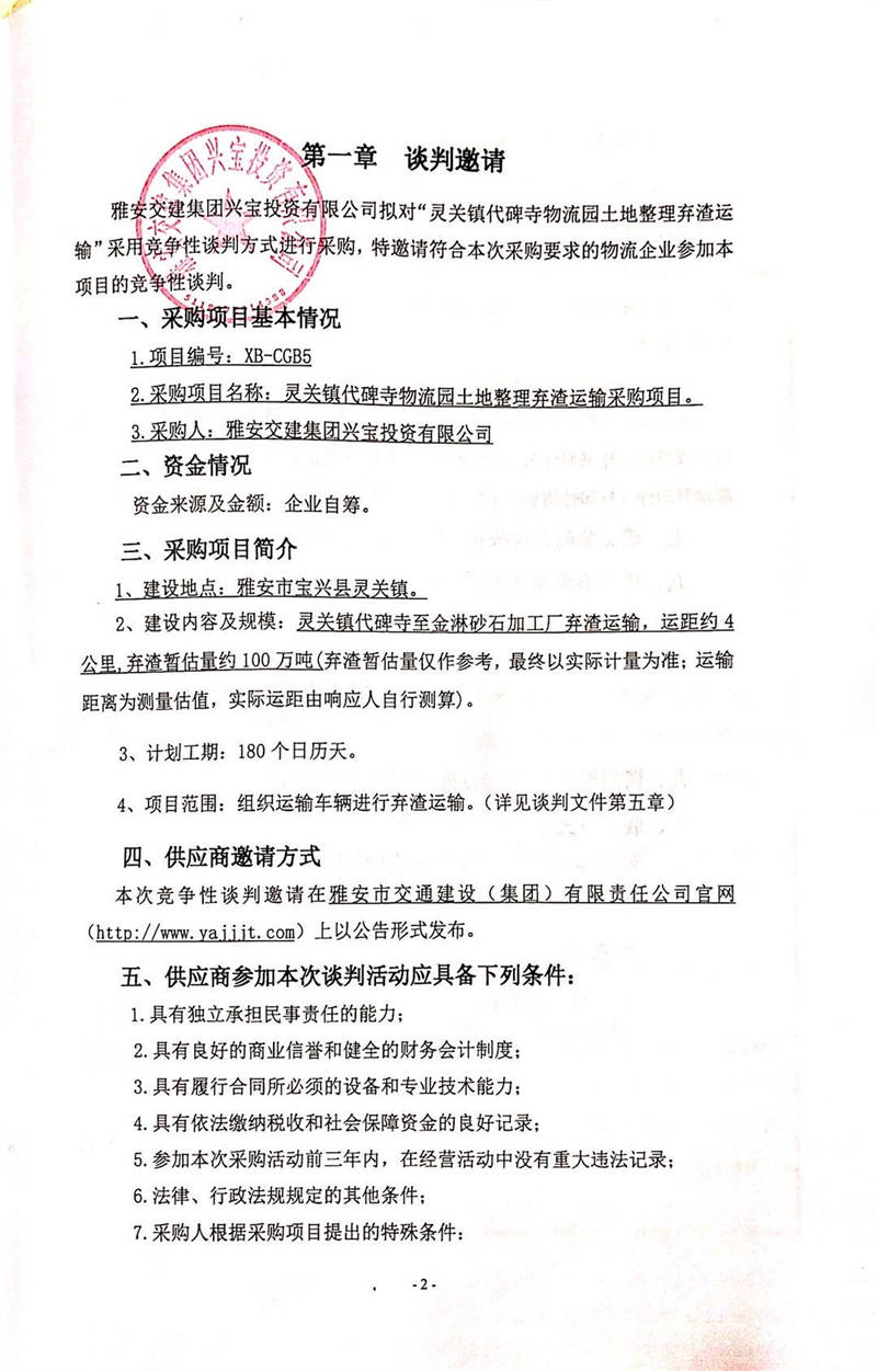 雅安交建集團(tuán)興寶投資有限公司靈關(guān)鎮(zhèn)代碑寺物流園土地整理棄渣運輸采購項目競爭性談判公告