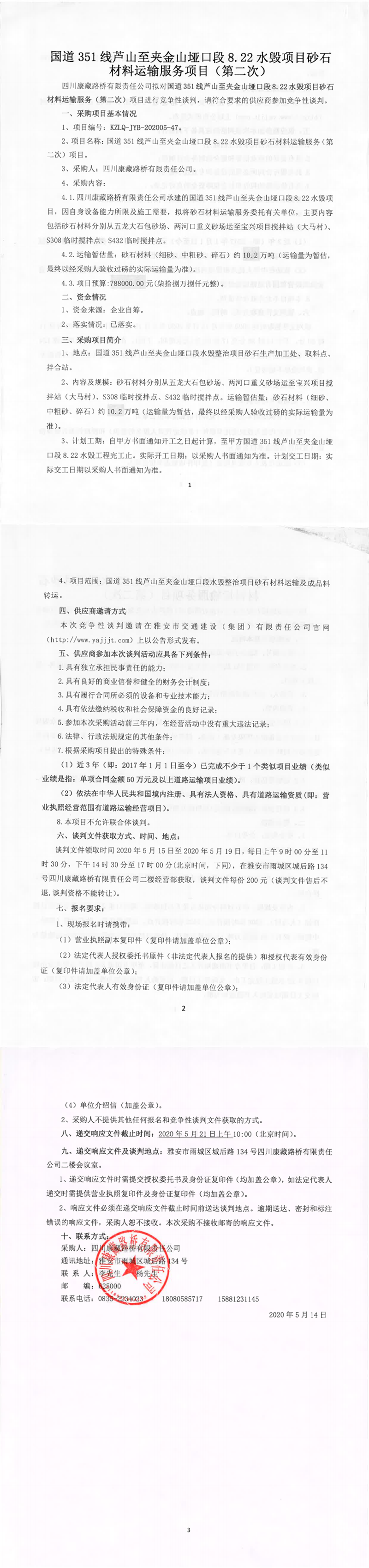 四川康藏路橋有限責任公司國道351線蘆山至夾金山埡口段8.22水毀項目砂石材料運輸服務項目(第二次)競爭性談判公告