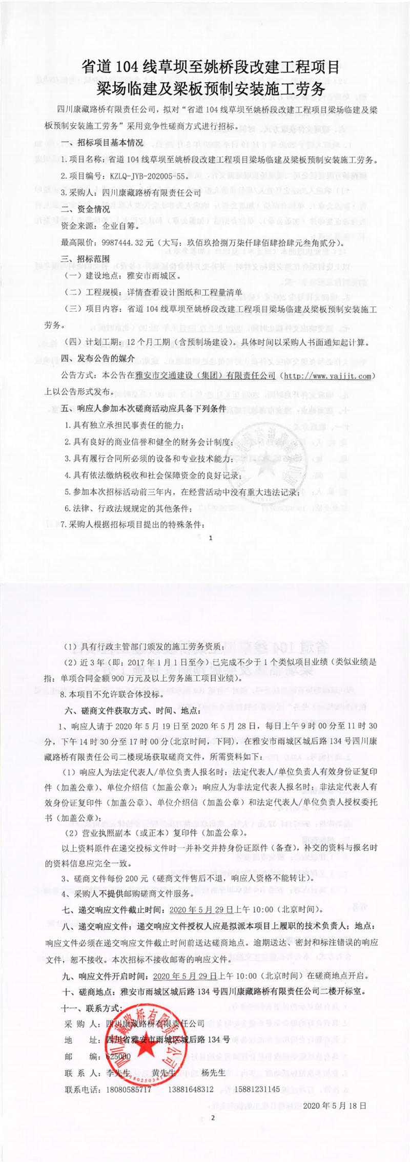 四川康藏路橋有限責(zé)任公司省道104線草壩至姚橋段改建工程項(xiàng)目梁場臨建及梁板預(yù)制安裝施工勞務(wù)競爭性磋商公告