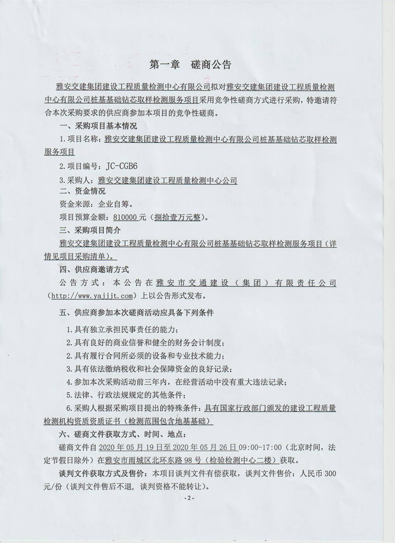 雅安交建集團建設工程質(zhì)量檢測中心有限公司樁基基礎鉆芯取樣檢測服務項目競爭性磋商公告