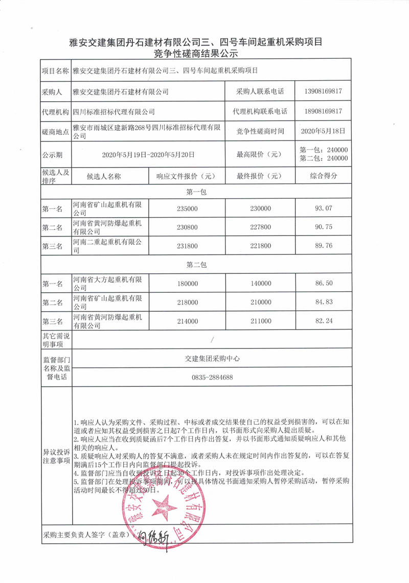 雅安交建集團(tuán)丹石建材有限公司三、四號車間起重機(jī)采購項(xiàng)目競爭性磋商結(jié)果公示