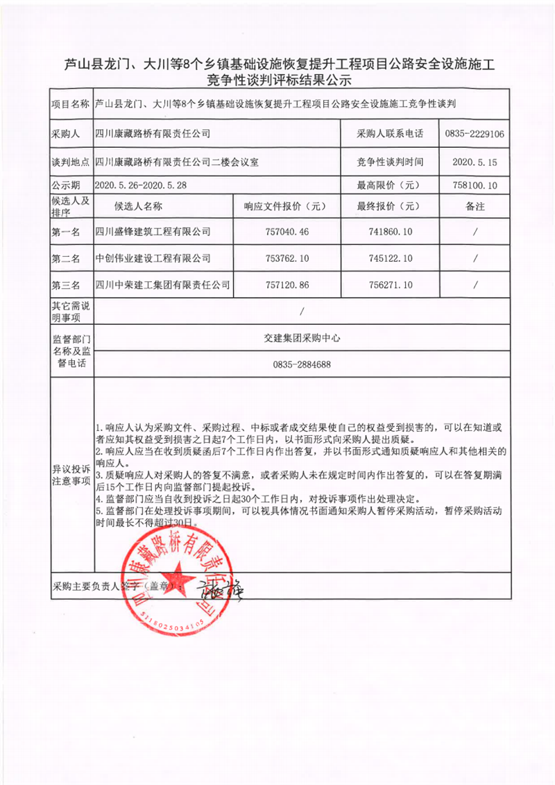 四川康藏路橋有限責(zé)任公司蘆山縣龍門(mén)、大川等8個(gè)鄉(xiāng)鎮(zhèn)基礎(chǔ)設(shè)施恢復(fù)提升工程項(xiàng)目公路安全設(shè)施施工競(jìng)爭(zhēng)性談判評(píng)標(biāo)結(jié)果公示