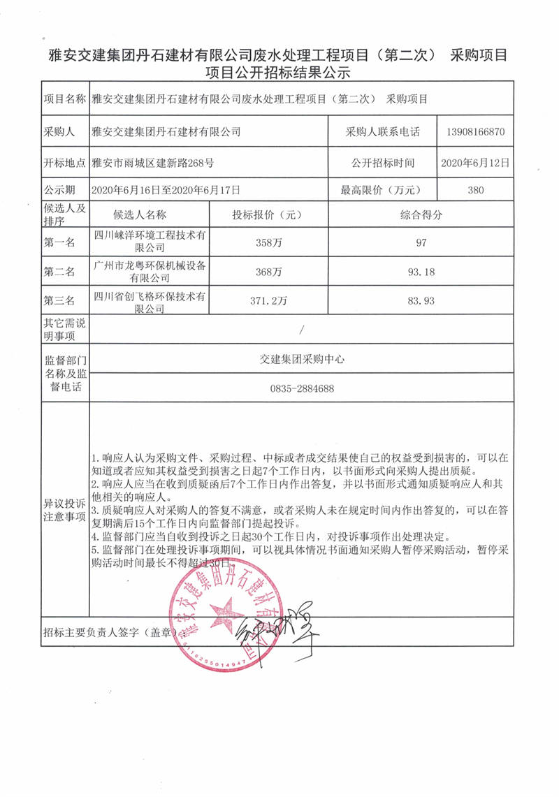 雅安交建集團(tuán)丹石建材有限公司廢水處理工程項目(第二次)采購項目公開招標(biāo)結(jié)果公示
