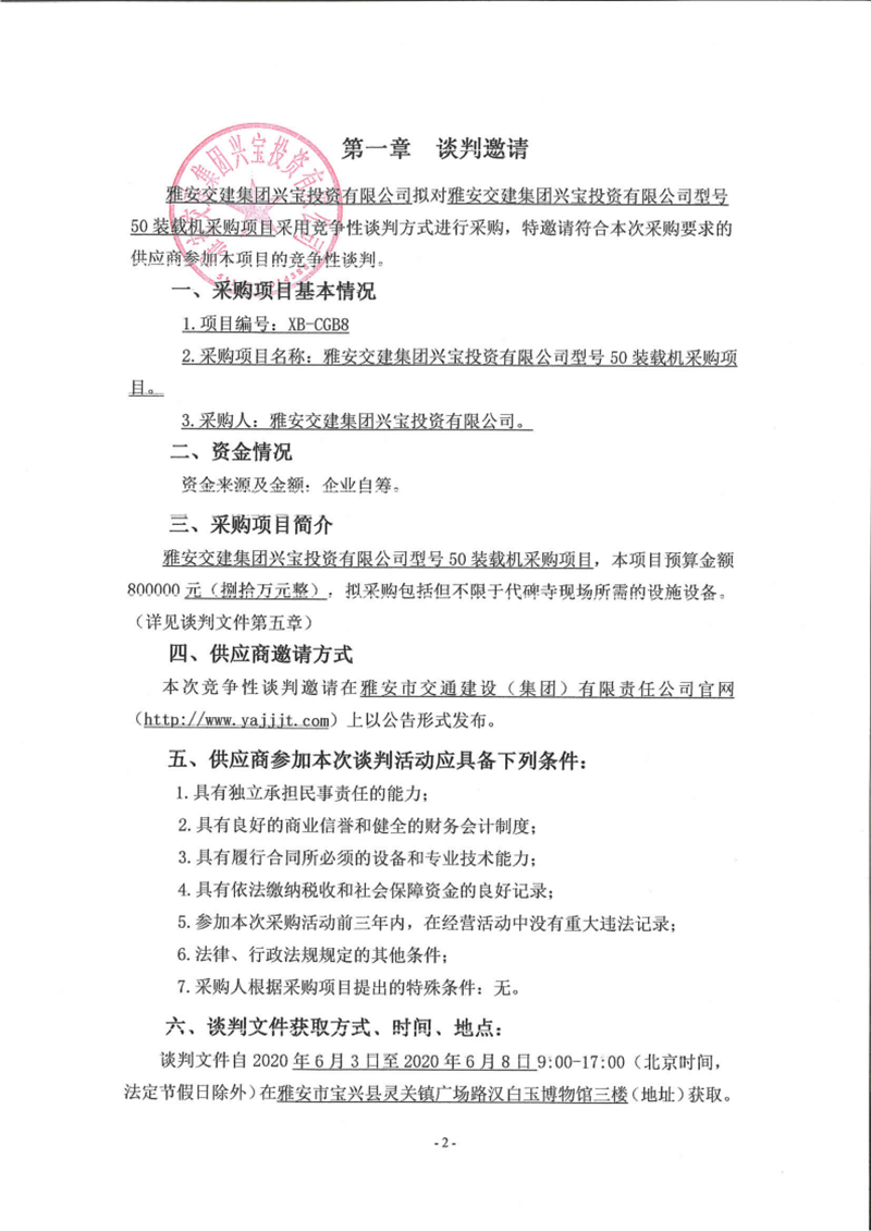 雅安交建集團(tuán)興寶投資有限公司型號(hào)50裝載機(jī)采購(gòu)項(xiàng)目(第二次)競(jìng)爭(zhēng)性談判公告
