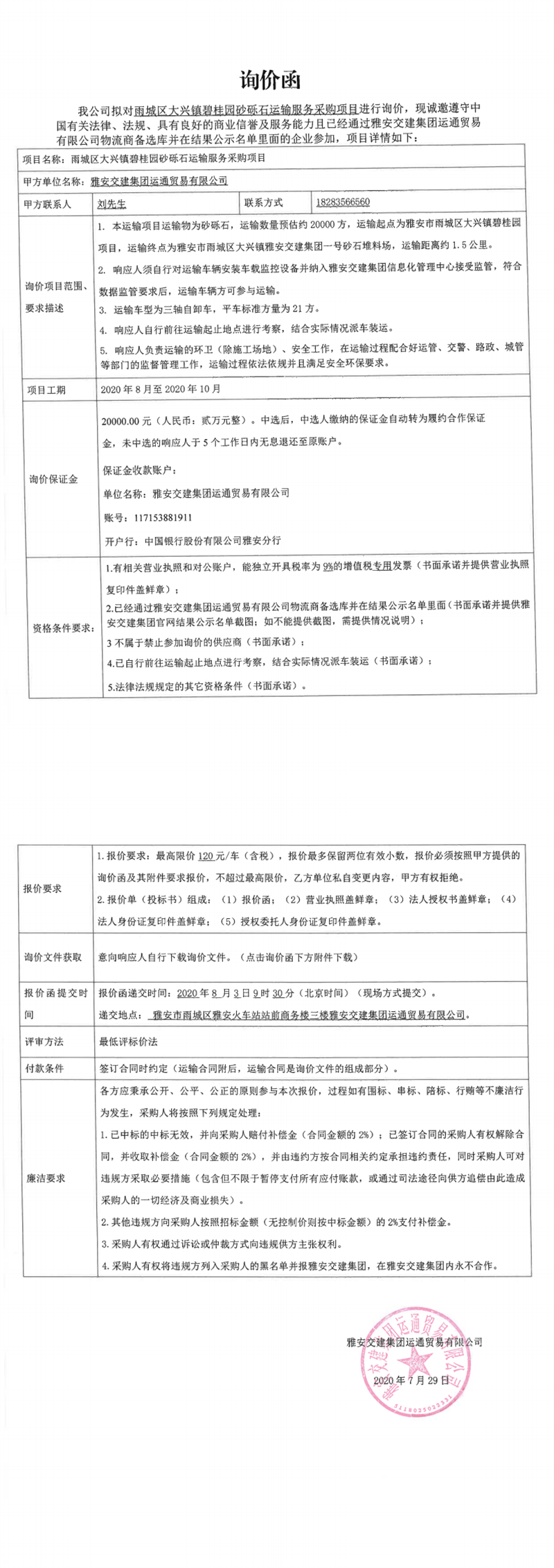 雅安交建集團運通貿易有限公司雨城區(qū)大興鎮(zhèn)碧桂園砂礫石運輸服務采購項目(第二次)詢價函