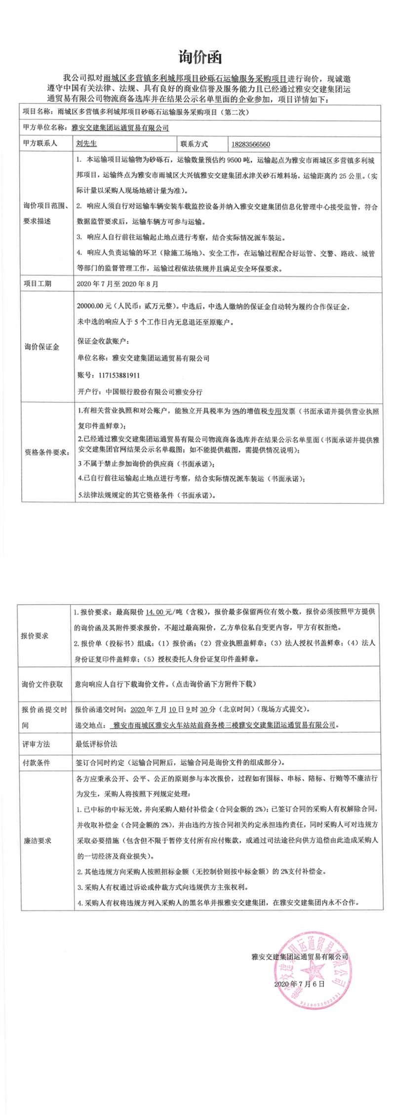雅安交建集團(tuán)運(yùn)通貿(mào)易有限公司雨城區(qū)多營(yíng)鎮(zhèn)多利城邦項(xiàng)目砂礫石運(yùn)輸服務(wù)采購項(xiàng)目(第二次)詢價(jià)函