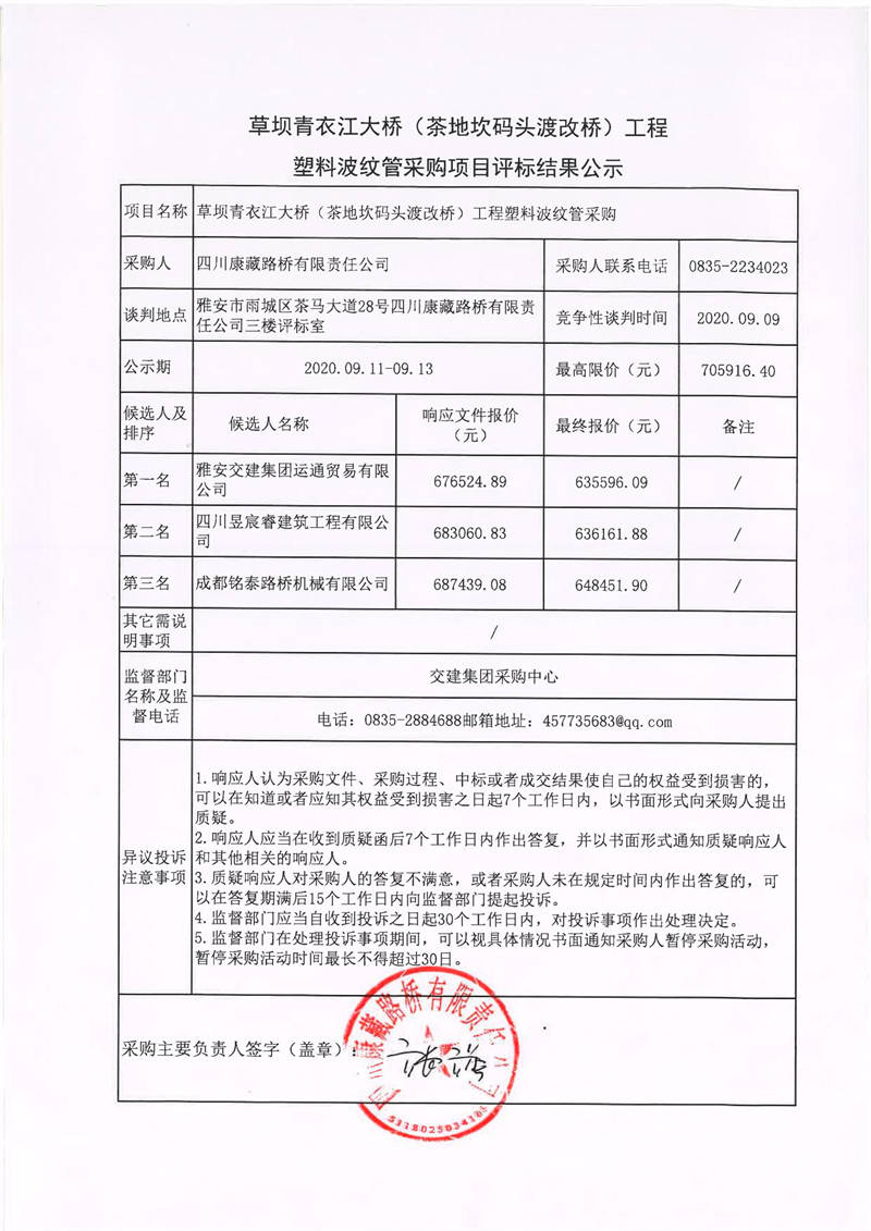 四川康藏路橋有限責(zé)任公司草壩青衣江大橋(茶地坎碼頭渡改橋)工程塑料波紋管采購項目評標(biāo)結(jié)果公示