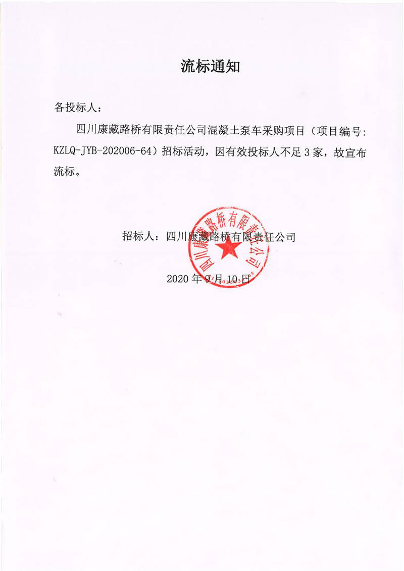 四川康藏路橋有限責(zé)任公司混凝土泵車采購項(xiàng)目流標(biāo)通知