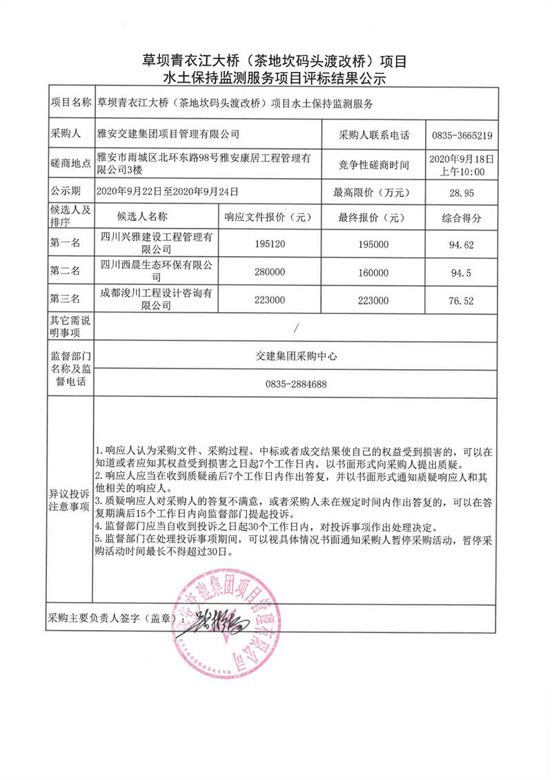 雅安交建集團(tuán)項(xiàng)目管理有限公司草壩青衣江大橋(茶地坎碼頭渡改橋)項(xiàng)目水土保持監(jiān)測(cè)服務(wù)項(xiàng)目評(píng)標(biāo)結(jié)果公示