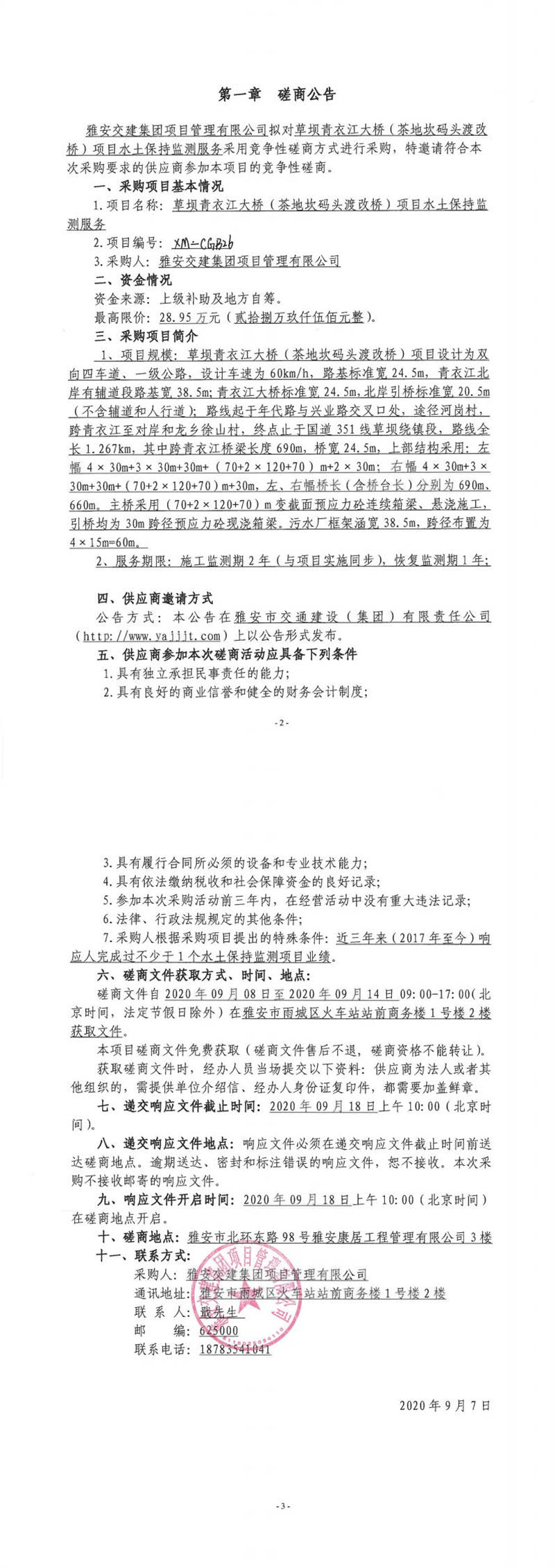 雅安交建集團項目管理有限公司草壩青衣江大橋(茶地坎碼頭渡改橋)項目水土保持監(jiān)測服務競爭性磋商公告